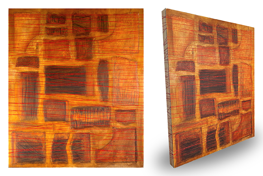 Clear Cut Bristol paper, Coffee Grounds, Acrylic Medium, Oil & Cold Wax, Graphite and dyed string Surface: Clayboard / Hard panel (1″ deep) 20” x 24” $1200 0%